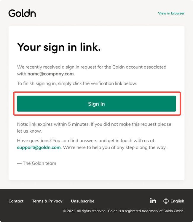 After requesting your sign in link, check your email inbox. Click the Sign In button to continue to the Goldn Dashboard.
